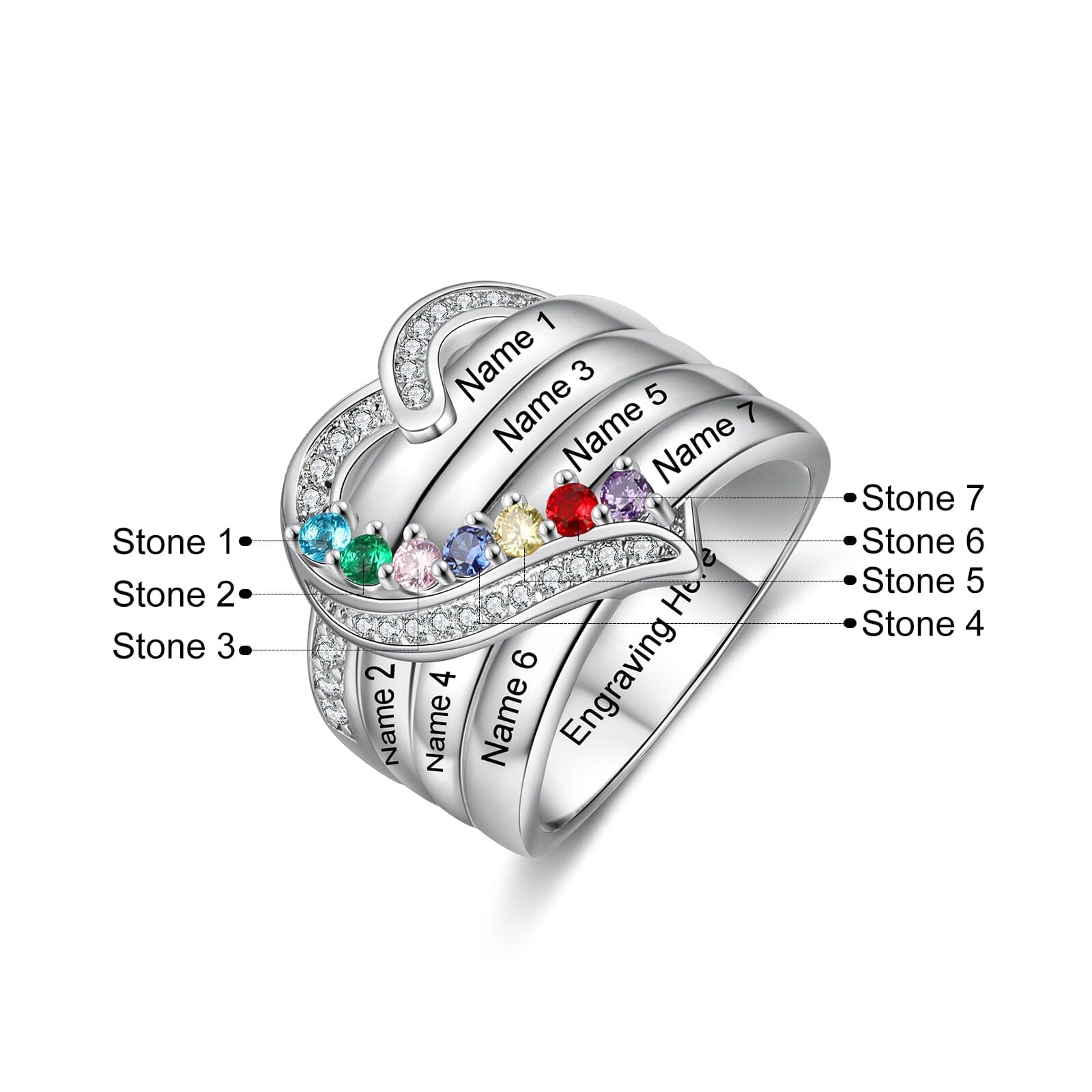 Bague argent 925 sterling personnalisable avec de 1à 8 prénom(s) gravé(s) bague avec pierre de naissance de couleur personnalisée également coeur pour femmes cadeau de fête des mères