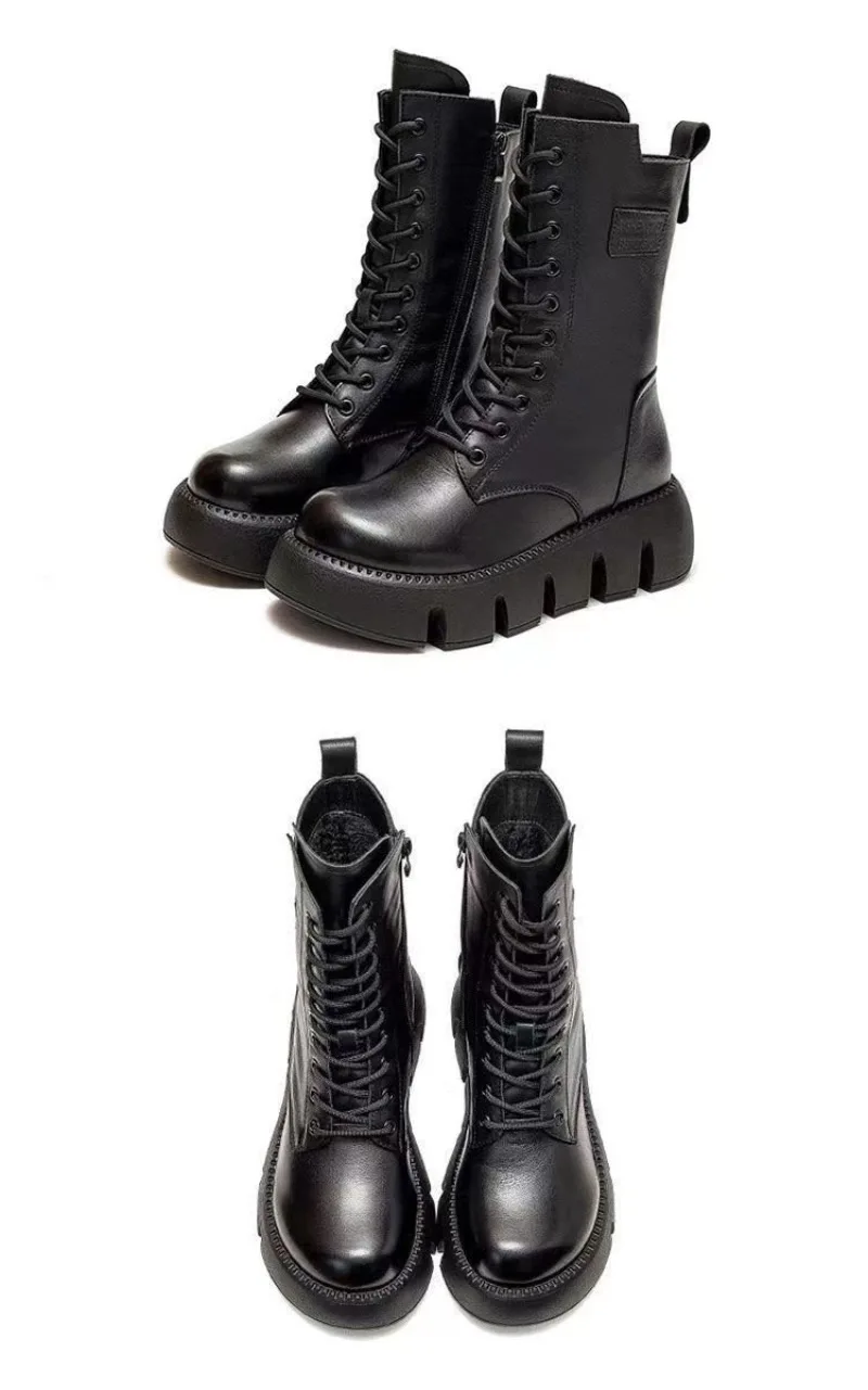 Bottes en cuir tendance à lacets et fermeture éclair pour femmes, montantes, décontractées, fourrées chaudes, antidérapantes, saison froide
